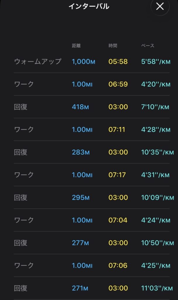 リレーマラソンは1.6kmのコースを周回してタスキをつなぎ、4時間の制限時間で何周出来るかを競うようなので、1.6km(1マイル)の距離でインターバルをしてみました。目標は1km4分30秒!1マイルだと7分12秒というペースです。